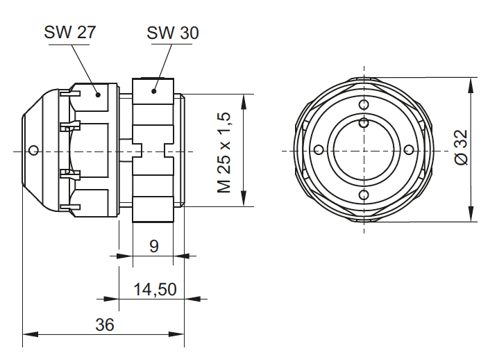- The gland can either be screwed in directly (thread min. 5 mm long) or fastened with a locknut (max. plate thickness: 6.5 mm) If the gland is not mounted in a horizontal position at the bottom, the degree of protection is reduced to IP64.
