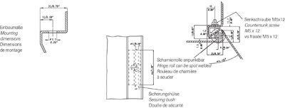 - 1 hinge consisting of: hinge mounting, weldable socket, countersunk screw M5x12 and security nut DIN 6923 M5.