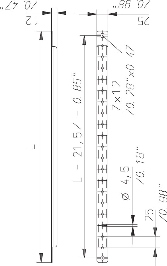 For lateral mounting of lightweight equipment, cable ducts, cable harnesses etc. inside the cabinet. With 4.5 mm holes every 25 mm for screws DIN 7500 M5x12 or DIN7516 M5x10.